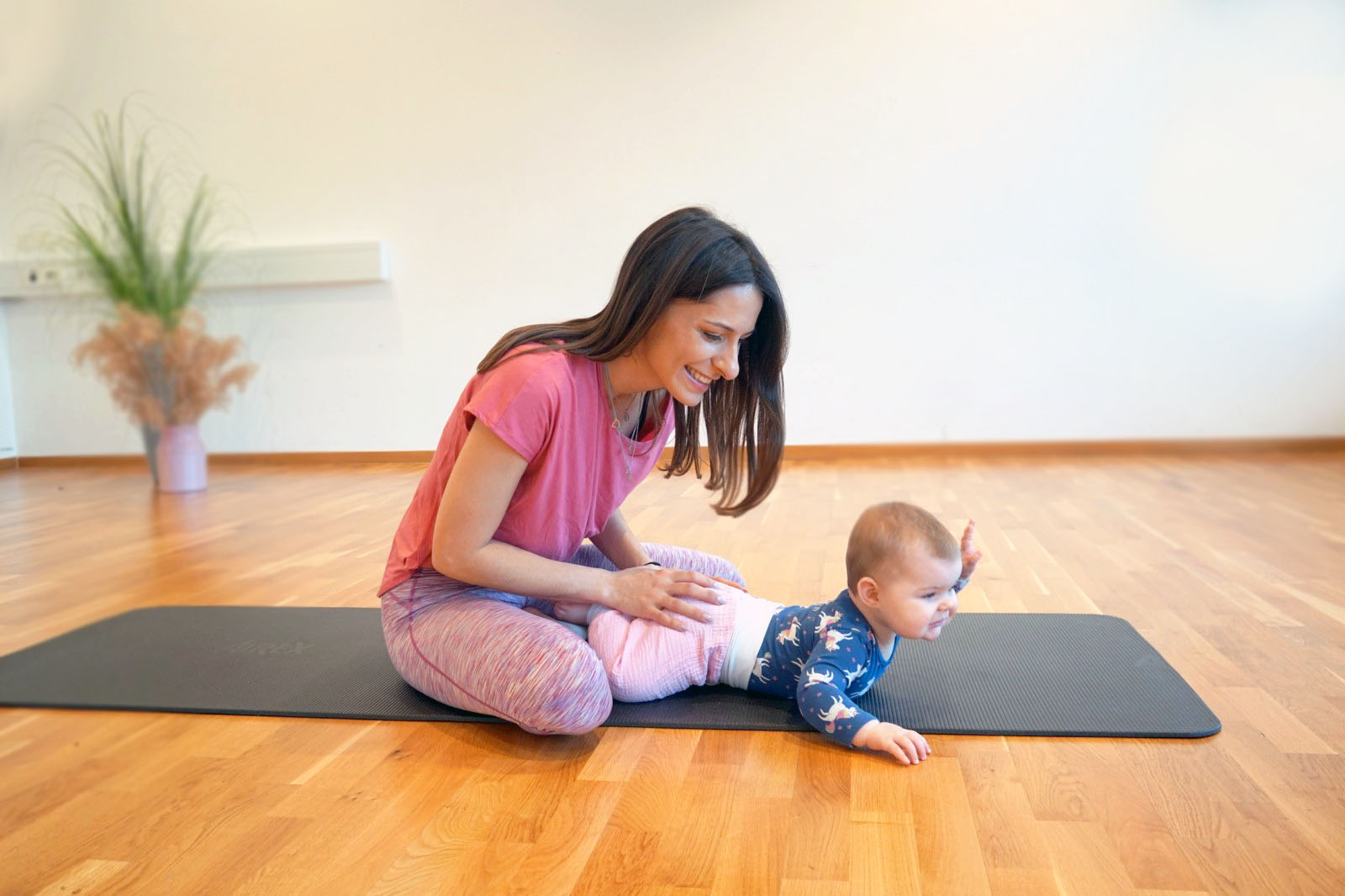 Vadba poteka v prijetnem vzdušju, kjer ob določenih vajah vključimo dojenčka zraven.